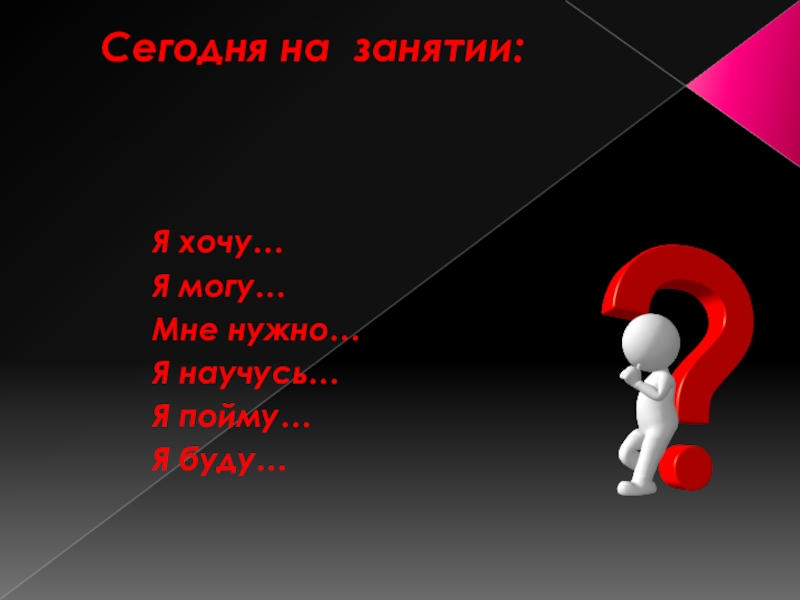 Сегодня на занятии:Я хочу…Я могу…Мне нужно…Я научусь…Я пойму…Я буду…