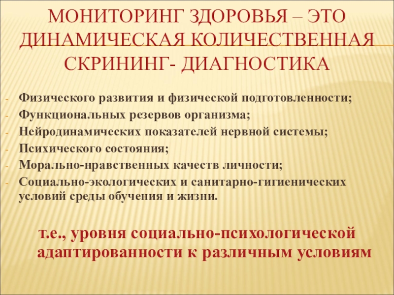 Слайд 12МОНИТОРИНГ ЗДОРОВЬЯ – ЭТО ДИНАМИЧЕСКАЯ КОЛИЧЕСТВЕННАЯ СКРИНИНГ- ДИАГНОСТИКА