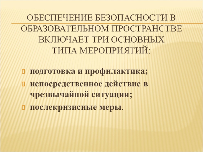 Слайд 19ОБЕСПЕЧЕНИЕ БЕЗОПАСНОСТИ В ОБРАЗОВАТЕЛЬНОМ ПРОСТРАНСТВЕ ВКЛЮЧАЕТ ТРИ ОСНОВНЫХ