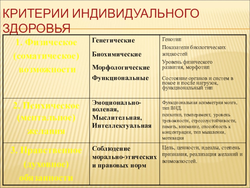 Слайд 11КРИТЕРИИ ИНДИВИДУАЛЬНОГО ЗДОРОВЬЯ