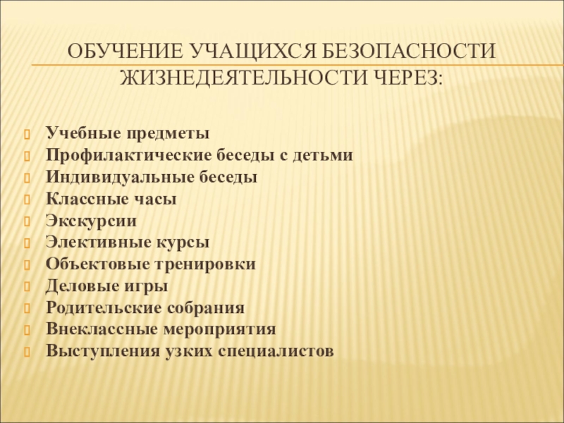 Слайд 18ОБУЧЕНИЕ УЧАЩИХСЯ БЕЗОПАСНОСТИ ЖИЗНЕДЕЯТЕЛЬНОСТИ ЧЕРЕЗ: