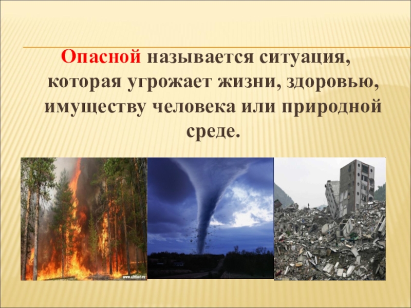 Слайд 6Опасной называется ситуация, которая угрожает жизни, здоровью, имуществу человека или природной