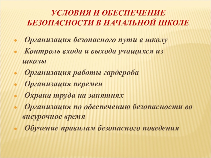 Слайд 21УСЛОВИЯ И ОБЕСПЕЧЕНИЕ БЕЗОПАСНОСТИ В НАЧАЛЬНОЙ ШКОЛЕ