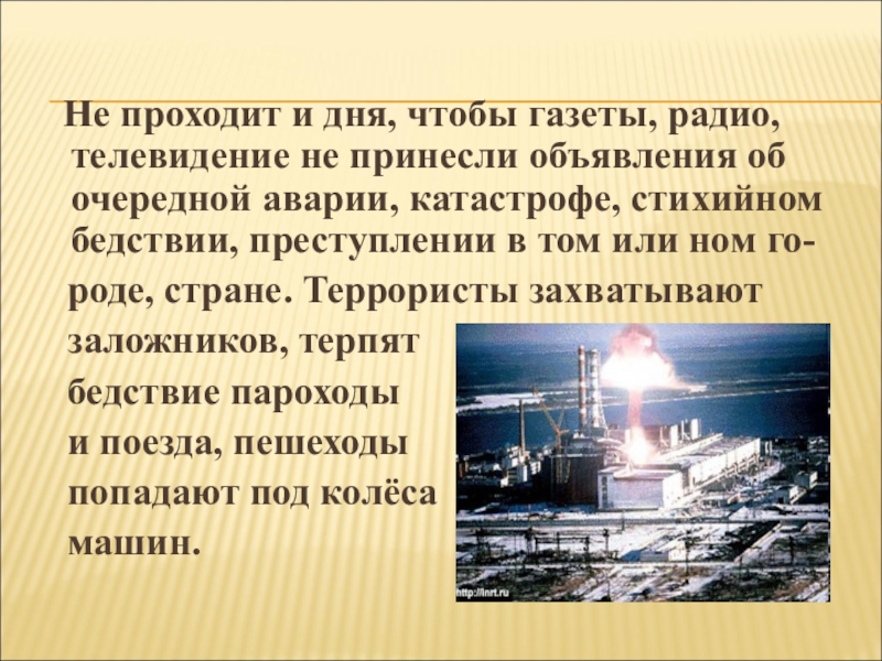 принесли объявления об очередной аварии, катастрофе, стихийном бедствии, преступлении в том или ном го-