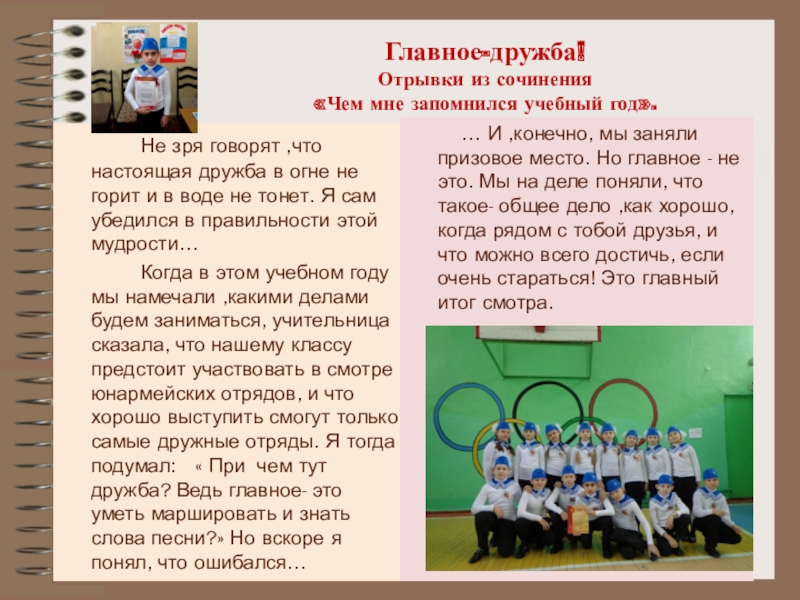 … И ,конечно, мы заняли призовое место. Но главное - не это. Мы на деле поняли, что такое- общее дело ,как хорошо, когда рядом с тобой друзья, и что можно всего достичь, если очень стараться! Это главный итог смотра.