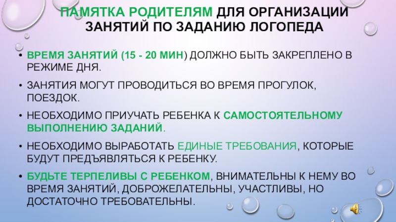 Слайд 15ПАМЯТКА РОДИТЕЛЯМ ДЛЯ ОРГАНИЗАЦИИ ЗАНЯТИЙ ПО ЗАДАНИЮ ЛОГОПЕДА