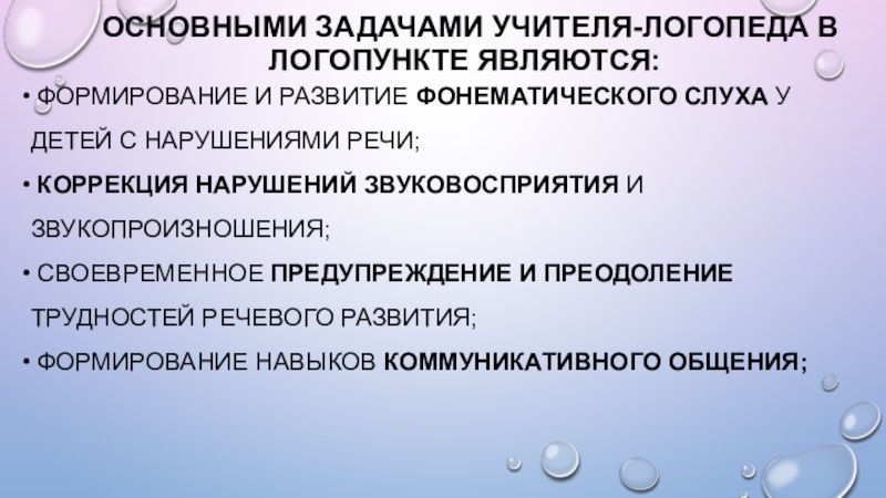 Слайд 4 ОСНОВНЫМИ ЗАДАЧАМИ УЧИТЕЛЯ-ЛОГОПЕДА В ЛОГОПУНКТЕ ЯВЛЯЮТСЯ: