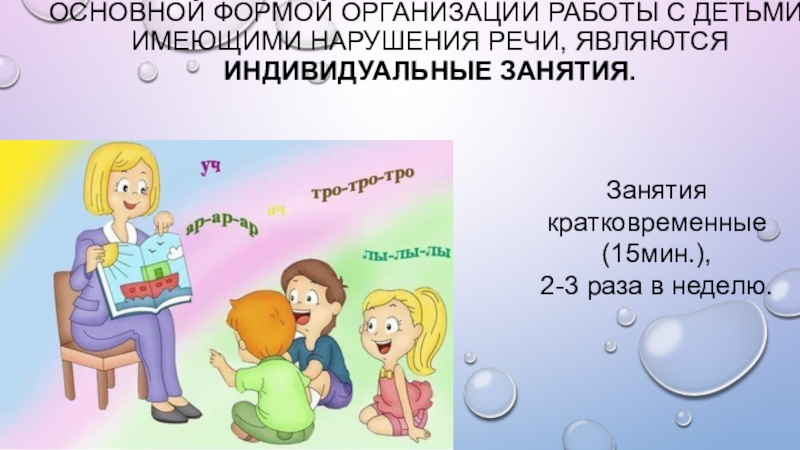 Слайд 12ОСНОВНОЙ ФОРМОЙ ОРГАНИЗАЦИИ РАБОТЫ С ДЕТЬМИ, ИМЕЮЩИМИ НАРУШЕНИЯ РЕЧИ, ЯВЛЯЮТСЯ ИНДИВИДУАЛЬНЫЕ