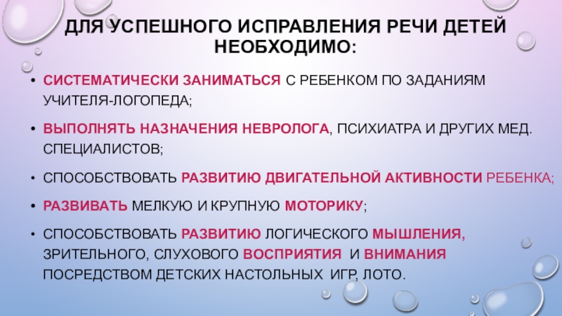 Слайд 11ДЛЯ УСПЕШНОГО ИСПРАВЛЕНИЯ РЕЧИ ДЕТЕЙ НЕОБХОДИМО: