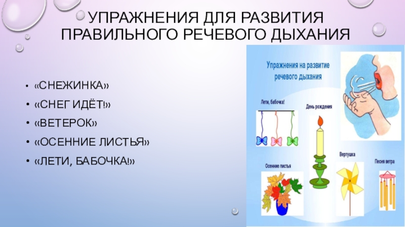 Слайд 18УПРАЖНЕНИЯ ДЛЯ РАЗВИТИЯ ПРАВИЛЬНОГО РЕЧЕВОГО ДЫХАНИЯ