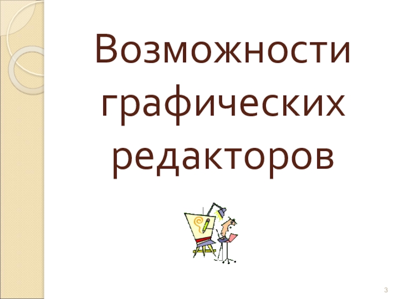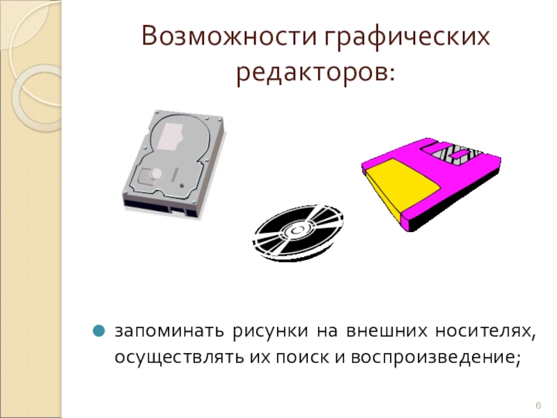 Возможности графических редакторов:запоминать рисунки на внешних носителях, осуществлять их поиск и воспроизведение;