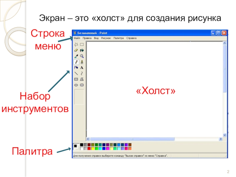 Экран – это «холст» для создания рисунка Набор инструментовПалитра«Холст»Строкаменю