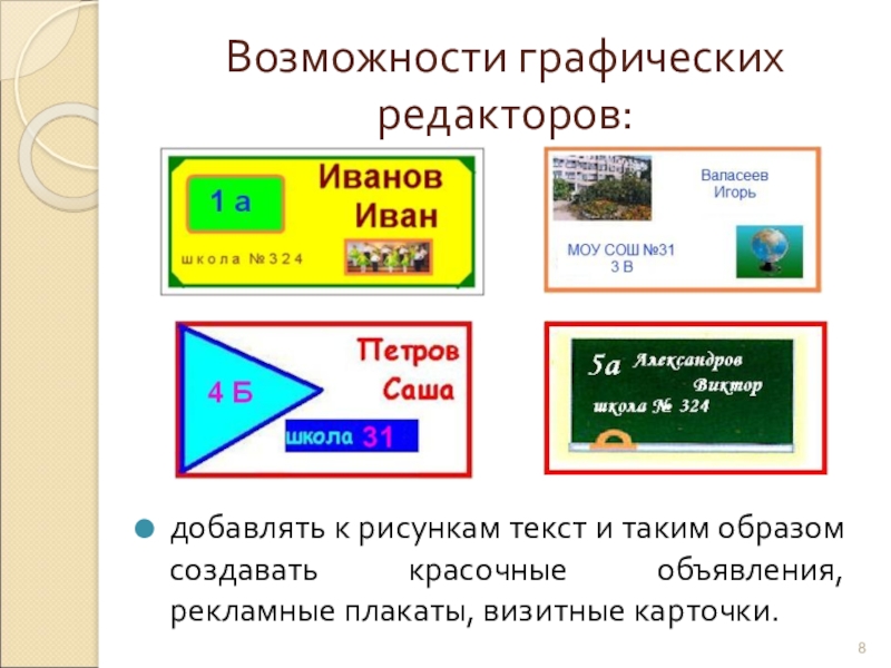 Возможности графических редакторов:добавлять к рисункам текст и таким образом создавать красочные объявления, рекламные плакаты, визитные карточки.
