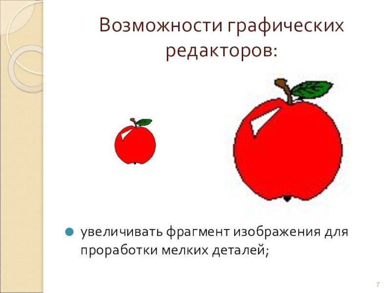 Возможности графических редакторов:увеличивать фрагмент изображения для проработки мелких деталей;