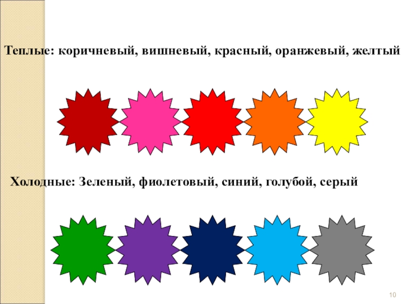 Теплые: коричневый, вишневый, красный, оранжевый, желтый Холодные: Зеленый, фиолетовый, синий, голубой, серый