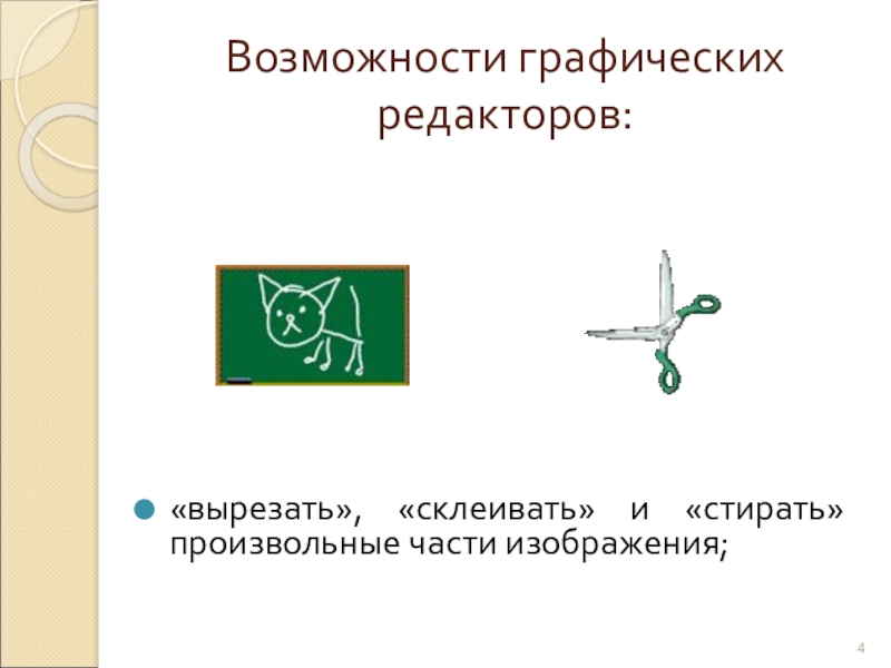 Возможности графических редакторов:«вырезать», «склеивать» и «стирать» произвольные части изображения;