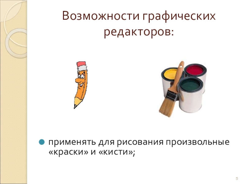 Возможности графических редакторов:применять для рисования произвольные «краски» и «кисти»;
