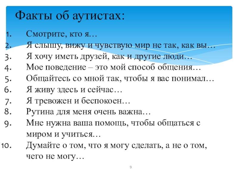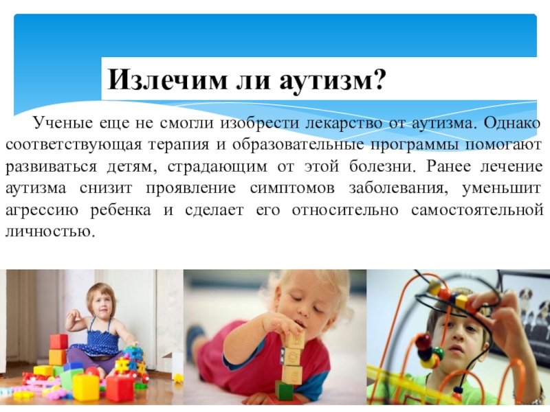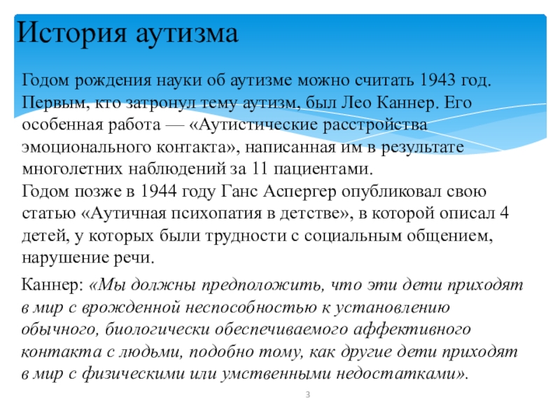 Каннер: «Мы должны предположить, что эти дети приходят в мир с врожденной неспособностью к установлению обычного, биологически обеспечиваемого аффективного контакта с людьми, подобно тому, как другие дети приходят в мир с физическими или умственными недостатками».