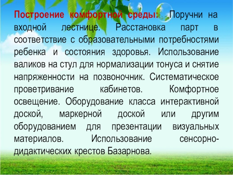 с образовательными потребностями ребенка и состояния здоровья. Использование валиков на стул для нормализации тонуса и снятие напряженности на позвоночник. Систематическое проветривание кабинетов. Комфортное освещение. Оборудование класса интерактивной доской, маркерной доской или другим оборудованием для презентации визуальных материалов. Использование сенсорно-дидактических крестов Базарнова.