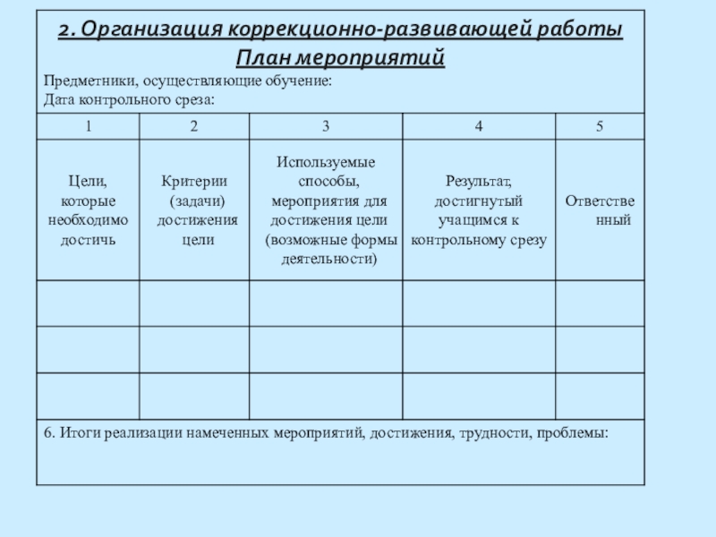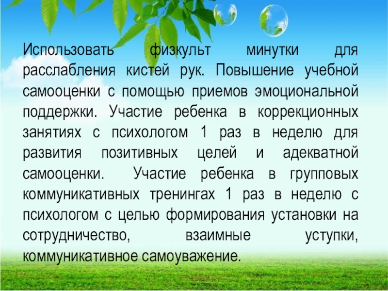 помощью приемов эмоциональной поддержки. Участие ребенка в коррекционных занятиях с психологом 1 раз в неделю для развития позитивных целей и адекватной самооценки. Участие ребенка в групповых коммуникативных тренингах 1 раз в неделю с психологом с целью формирования установки на сотрудничество, взаимные уступки, коммуникативное самоуважение.
