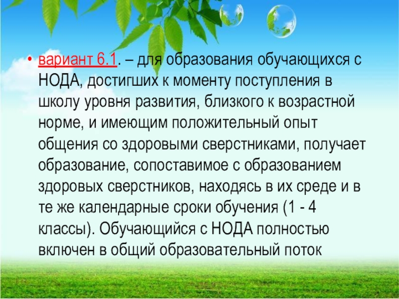 поступления в школу уровня развития, близкого к возрастной норме, и имеющим положительный опыт общения со здоровыми сверстниками, получает образование, сопоставимое с образованием здоровых сверстников, находясь в их среде и в те же календарные сроки обучения (1 - 4 классы). Обучающийся с НОДА полностью включен в общий образовательный поток