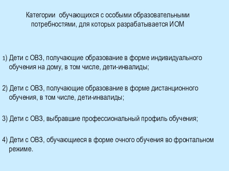 Слайд 2Категории обучающихся с особыми образовательными потребностями, для которых разрабатывается ИОМ