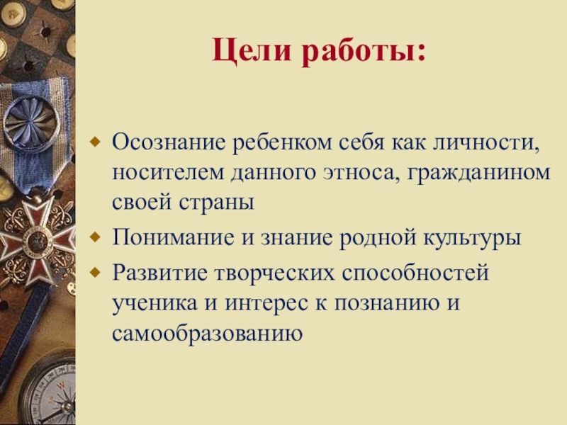 Цели работы: Осознание ребенком себя как личности, носителем данного этноса, гражданином своей страныПонимание и знание родной культурыРазвитие творческих способностей ученика и интерес к познанию и самообразованию