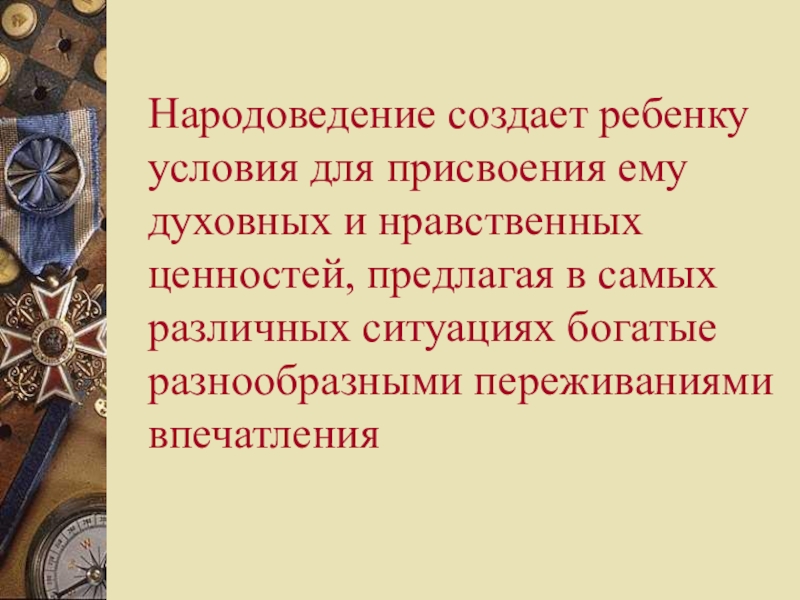 Слайд 16 Народоведение создает ребенку условия для присвоения ему духовных и нравственных ценностей,