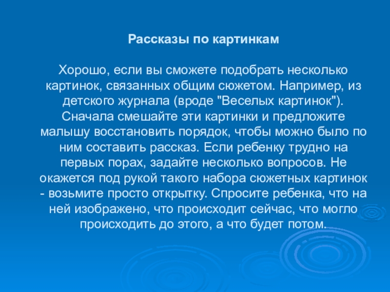 сюжетом. Например, из детского журнала (вроде "Веселых картинок"). Сначала смешайте эти картинки и предложите малышу восстановить порядок, чтобы можно было по ним составить рассказ. Если ребенку трудно на первых порах, задайте несколько вопросов. Не окажется под рукой такого набора сюжетных картинок - возьмите просто открытку. Спросите ребенка, что на ней изображено, что происходит сейчас, что могло происходить до этого, а что будет потом.