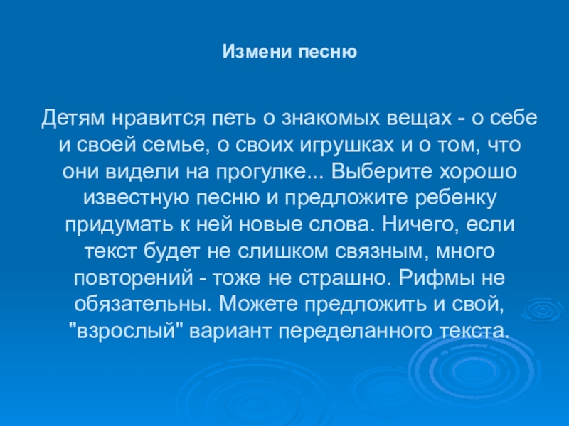 своей семье, о своих игрушках и о том, что они видели на прогулке... Выберите хорошо известную песню и предложите ребенку придумать к ней новые слова. Ничего, если текст будет не слишком связным, много повторений - тоже не страшно. Рифмы не обязательны. Можете предложить и свой, "взрослый" вариант переделанного текста.