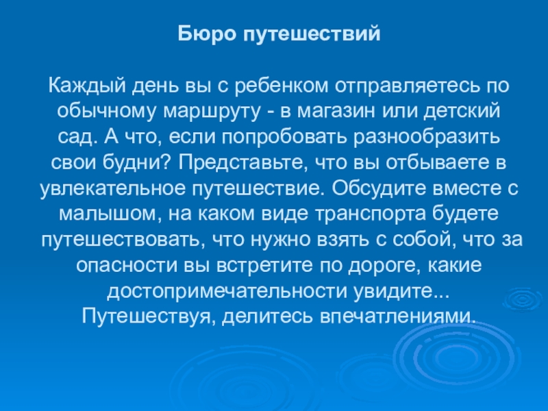 в магазин или детский сад. А что, если попробовать разнообразить свои будни? Представьте, что вы отбываете в увлекательное путешествие. Обсудите вместе с малышом, на каком виде транспорта будете путешествовать, что нужно взять с собой, что за опасности вы встретите по дороге, какие достопримечательности увидите... Путешествуя, делитесь впечатлениями.