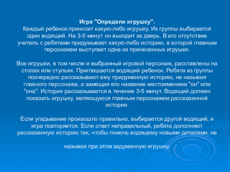 водящий. На 3-5 минут он выходит за дверь. В его отсутствие учитель с ребятами придумывает какую-либо историю, в которой главным персонажем выступает одна из принесенных игрушек.