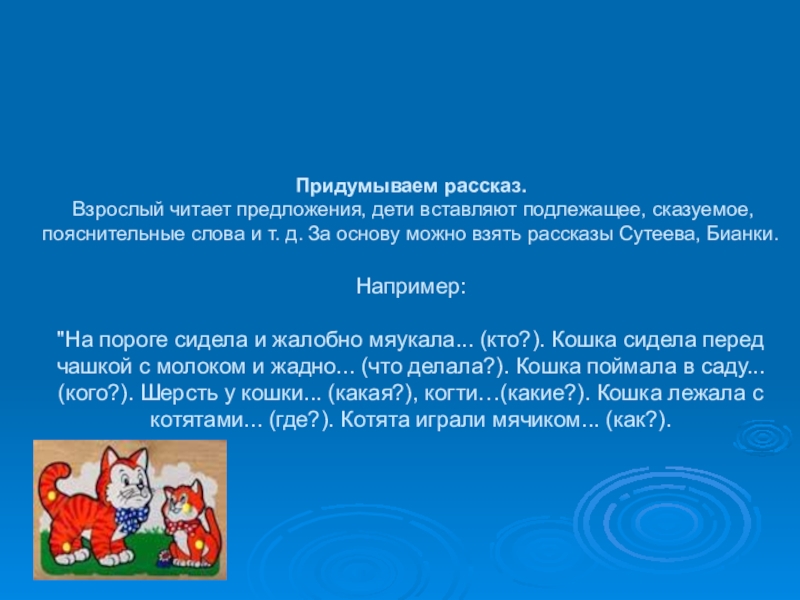 "На пороге сидела и жалобно мяукала... (кто?). Кошка сидела перед чашкой с молоком и жадно... (что делала?). Кошка поймала в саду... (кого?). Шерсть у кошки... (какая?), когти…(какие?). Кошка лежала с котятами... (где?). Котята играли мячиком... (как?).
