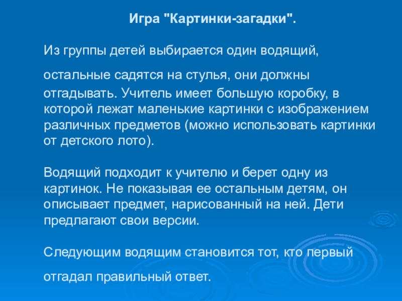 Из группы детей выбирается один водящий, остальные садятся на стулья, они должны отгадывать. Учитель имеет большую коробку, в которой лежат маленькие картинки с изображением различных предметов (можно использовать картинки от детского лото).