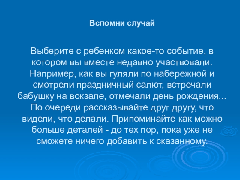 участвовали. Например, как вы гуляли по набережной и смотрели праздничный салют, встречали бабушку на вокзале, отмечали день рождения... По очереди рассказывайте друг другу, что видели, что делали. Припоминайте как можно больше деталей - до тех пор, пока уже не сможете ничего добавить к сказанному.