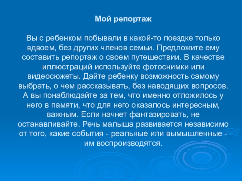 других членов семьи. Предложите ему составить репортаж о своем путешествии. В качестве иллюстраций используйте фотоснимки или видеосюжеты. Дайте ребенку возможность самому выбрать, о чем рассказывать, без наводящих вопросов. А вы понаблюдайте за тем, что именно отложилось у него в памяти, что для него оказалось интересным, важным. Если начнет фантазировать, не останавливайте. Речь малыша развивается независимо от того, какие события - реальные или вымышленные - им воспроизводятся.