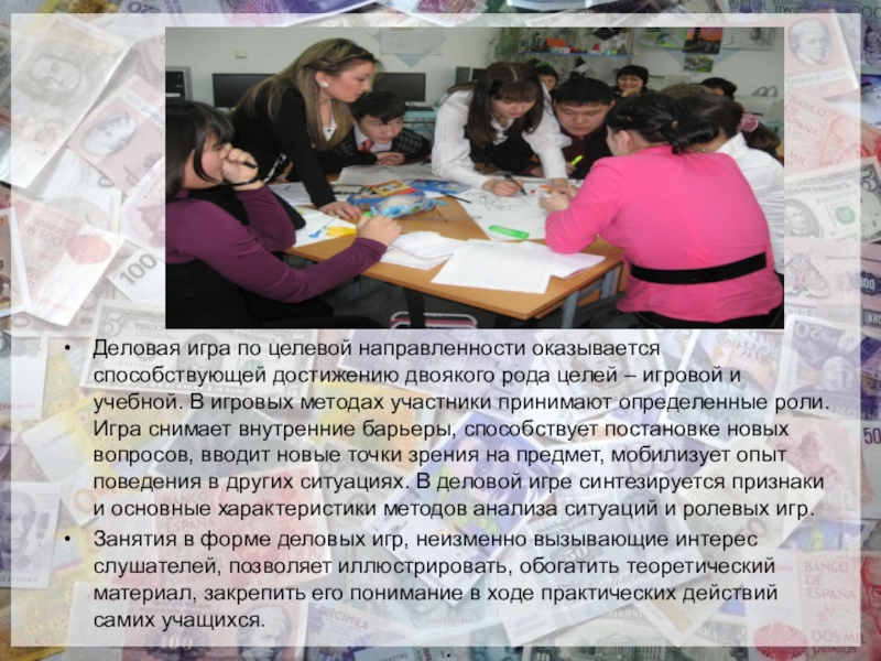 Занятия в форме деловых игр, неизменно вызывающие интерес слушателей, позволяет иллюстрировать, обогатить теоретический материал, закрепить его понимание в ходе практических действий самих учащихся.