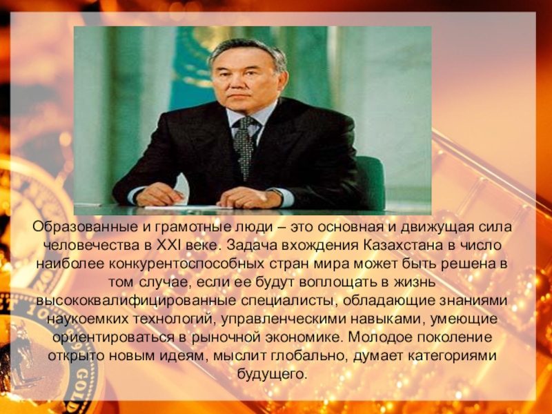 Образованные и грамотные люди – это основная и движущая сила человечества в XXI веке. Задача вхождения Казахстана