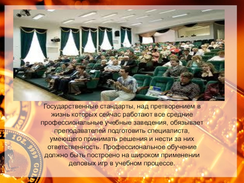 профессиональные учебные заведения, обязывает преподавателей подготовить специалиста, умеющего принимать решения и нести за них ответственность. Профессиональное обучение должно быть построено на широком применении деловых игр в учебном процессе.