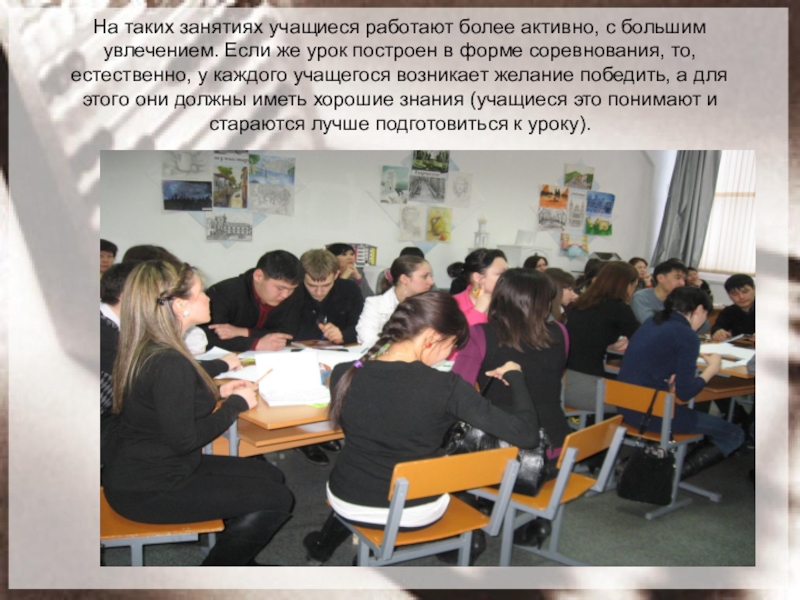 Слайд 12На таких занятиях учащиеся работают более активно, с большим увлечением. Если