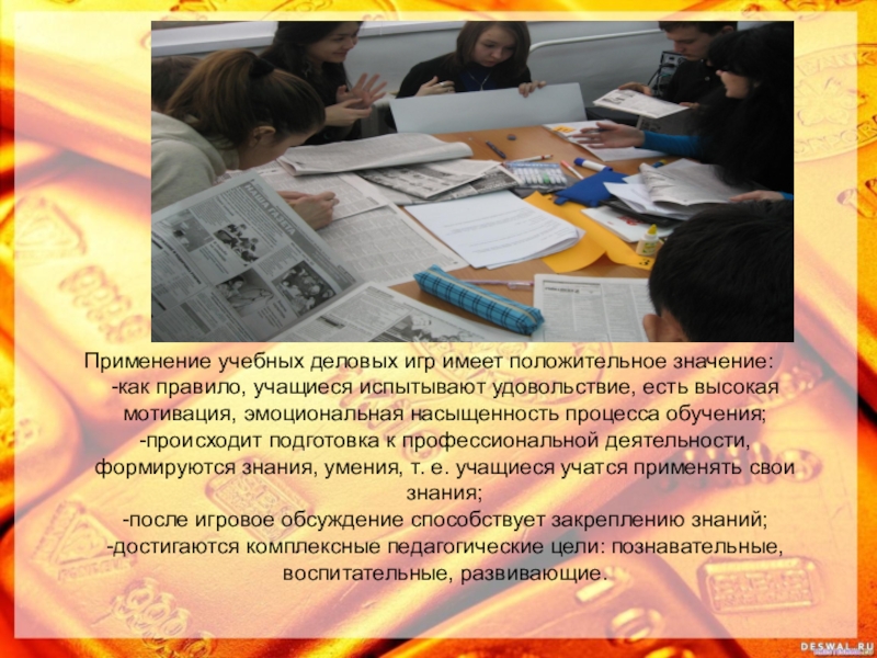 Применение учебных деловых игр имеет положительное значение: -как правило, учащиеся испытывают удовольствие, есть высокая мотивация, эмоциональная насыщенность