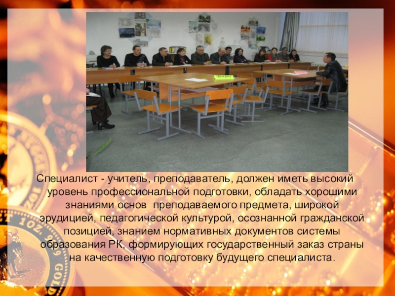 хорошими знаниями основ преподаваемого предмета, широкой эрудицией, педагогической культурой, осознанной гражданской позицией, знанием нормативных документов системы образования РК, формирующих государственный заказ страны на качественную подготовку будущего специалиста.