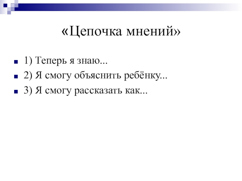 «Цепочка мнений»1) Теперь я знаю...2) Я смогу объяснить ребёнку...3) Я смогу рассказать как...