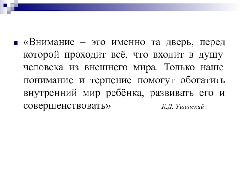 входит в душу человека из внешнего мира. Только наше понимание и терпение помогут обогатить внутренний мир ребёнка, развивать его и совершенствовать» К.Д. Ушинский