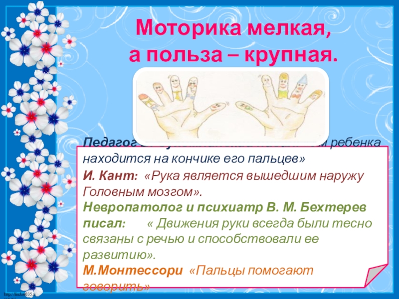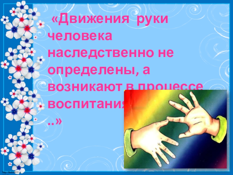 Невропатолог и психиатр В. М. Бехтерев писал: « Движения руки всегда были тесно связаны с речью и способствовали ее развитию».