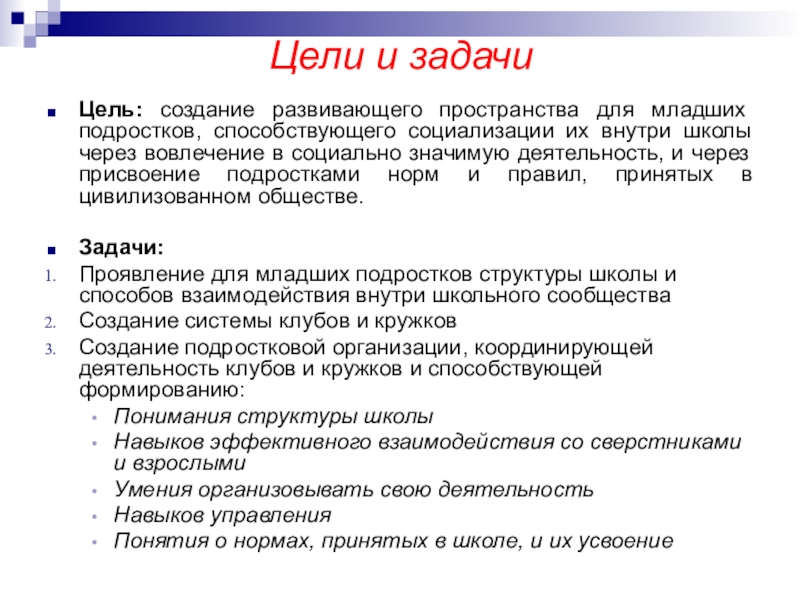 Цели и задачиЦель: создание развивающего пространства для младших подростков, способствующего социализации их внутри школы через вовлечение в социально значимую деятельность, и через присвоение подростками норм и правил, принятых в цивилизованном обществе.Задачи:Проявление для младших подростков структуры школы