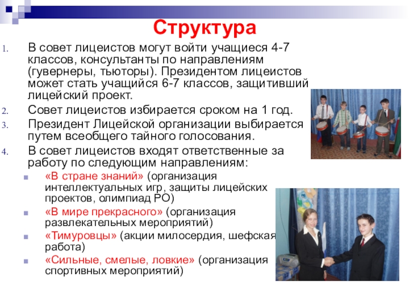 Структура В совет лицеистов могут войти учащиеся 4-7 классов, консультанты по направлениям (гувернеры, тьюторы). Президентом лицеистов может