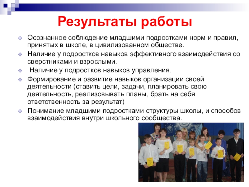 Результаты работыОсознанное соблюдение младшими подростками норм и правил, принятых в школе, в цивилизованном обществе.Наличие у подростков навыков