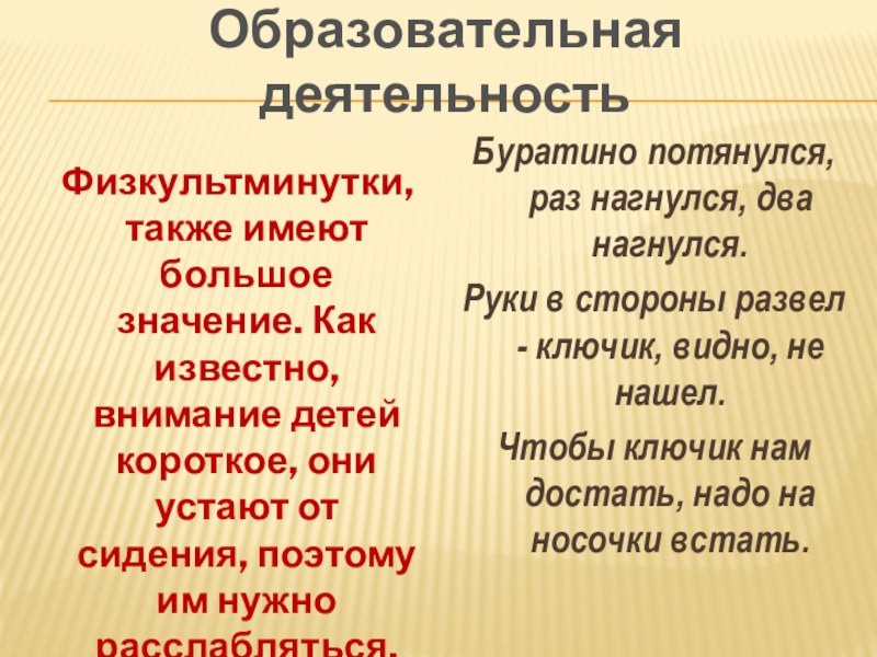 Буратино потянулся, раз нагнулся, два нагнулся.