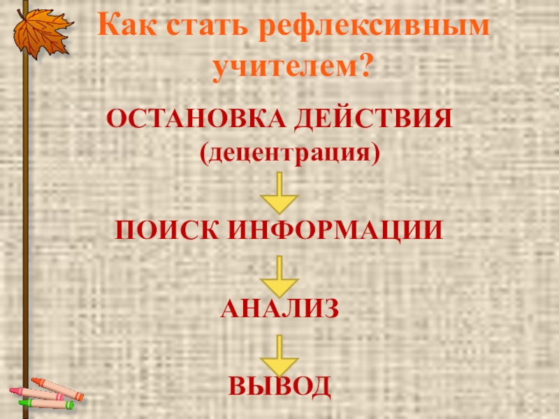 Как стать рефлексивным учителем?ОСТАНОВКА ДЕЙСТВИЯ (децентрация)ПОИСК ИНФОРМАЦИИ     АНАЛИЗ     ВЫВОД